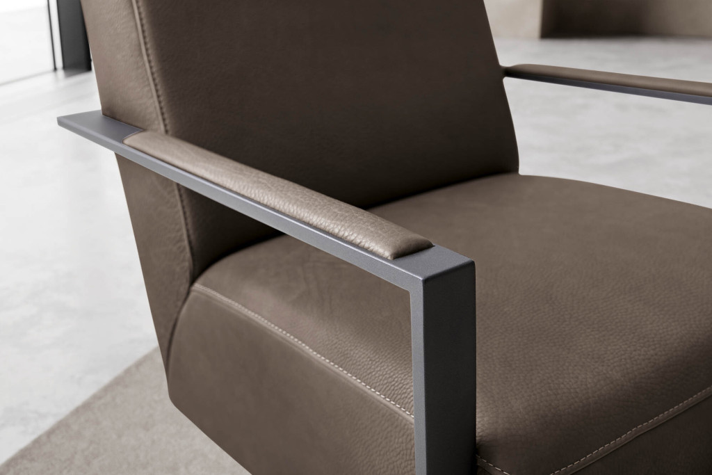 Dieser elegante Einzelsessel vereint Stil und Komfort in perfekter Harmonie. Sie haben die Wahl zwischen hochwertigem Stoff oder luxuriösem Leder, passend zu Ihrem Wohnstil. Bei Lederbezügen sorgt ein wählbarer Kontrastfaden für feine, stilvolle Akzente, die das Design noch individueller machen. Verschiedene Fußausführungen bieten Ihnen die Möglichkeit, den Sessel nach Ihrem Geschmack zu gestalten. Ob modern oder klassisch – dieser Sessel passt sich Ihren Wünschen an und wird schnell zum Lieblingsplatz in Ihrem Zuhause. Ein Möbelstück, das Design und Bequemlichkeit perfekt miteinander verbindet.