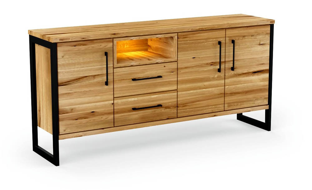 Entdecken Sie die zeitlose Eleganz unserer Anrichte aus massiver Charakter-Eiche. Die gebürstete und geölte Oberfläche verleiht dem Möbelstück eine warme, natürliche Ausstrahlung, während der Designgriff in Vintage Schwarz einen stilvollen Akzent setzt. Hochwertige Ganzmetall-Federbänder und Schübe mit Selbsteinzug garantieren Langlebigkeit und höchsten Bedienkomfort. Das robuste Gestell aus geschwärztem Roheisen rundet das markante Erscheinungsbild ab und sorgt für Stabilität. Diese Anrichte vereint meisterhafte Handwerkskunst mit modernem Design – ein unverzichtbares Highlight für Ihr Zuhause. Erleben Sie Qualität und Ästhetik auf höchstem Niveau.