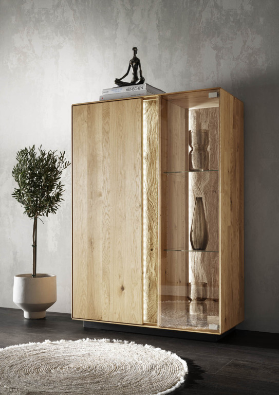 Das elegante Highboard beeindruckt durch seine hochwertige Verarbeitung aus massiver Wildeiche, natur geölt, und verbindet zeitloses Design mit moderner Funktionalität. Die harmonische Kombination aus Holz- und Glaselementen setzt stilvolle Akzente, während die integrierte LED-Beleuchtung für ein eindrucksvolles Ambiente sorgt. Dank durchdachter Innenaufteilung bietet das Highboard großzügigen Stauraum für Geschirr, Gläser oder Wohnaccessoires. Softclose-Technik an Türen und Schubladen sorgt für besonderen Komfort und ein sanftes Schließen. Die sandgestrahlten Rückwände unterstreichen den raffinierten Charakter dieses Möbelstücks. Mit klarer Linienführung und Liebe zum Detail fügt sich das Highboard perfekt in moderne Wohnkonzepte ein und wird zum stilvollen Mittelpunkt Ihres Wohnraums.