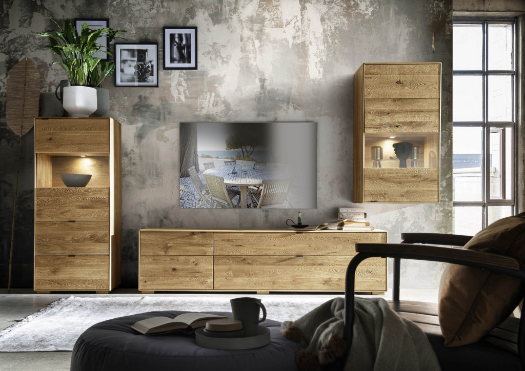 Dieses elegante Sideboard beeindruckt durch seine klare Linienführung und hochwertige Verarbeitung. Aus erstklassigem Massivholz gefertigt, fügt es sich harmonisch in unterschiedliche Wohnstile ein. Die drei Türen mit moderner Softclose-Technik gewährleisten ein leises und komfortables Schließen, während das großzügige Stauraumkonzept für Ordnung und Übersicht sorgt. Die natürliche Oberflächenbehandlung betont die ausdrucksstarke Holzstruktur und verleiht dem Möbelstück eine warme, zeitlose Ausstrahlung. Ein stilvolles Sideboard für anspruchsvolles Wohnen.