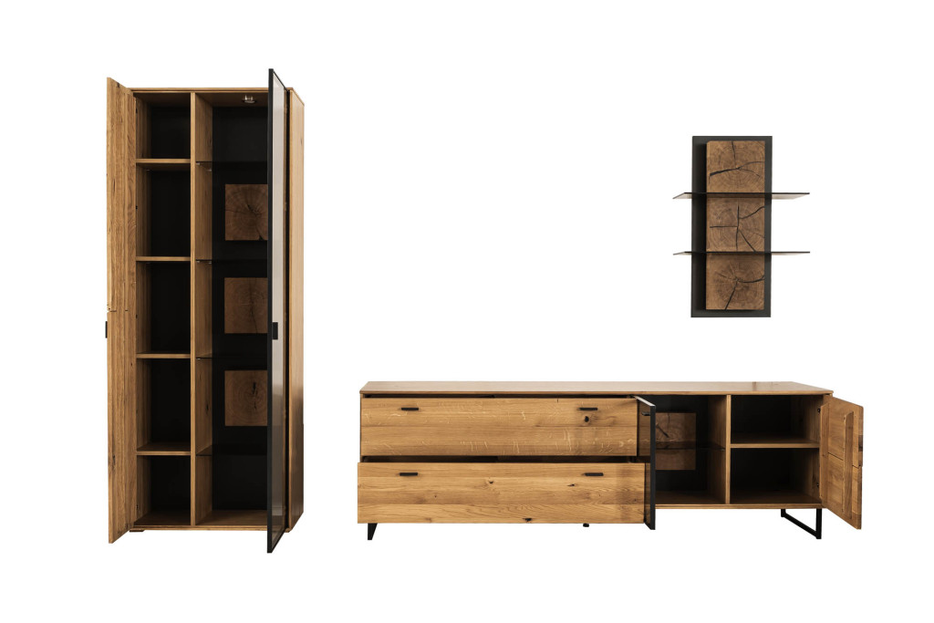 Entdecken Sie unsere exquisite Wohnkombination, die Eleganz und Funktionalität perfekt vereint. Die Fronten aus massiver Ast-/Balkeneiche mit durchgehender Lamelle in Wildeiche geölt verleihen Ihrem Wohnzimmer eine natürliche und warme Ausstrahlung. Der Korpus ist furniert in Wildeiche geölt und harmoniert ideal mit den anthrazitfarbenen Alurahmentüren, die mit braunem Parsolglas versehen sind. Dank der integrierten Tür- und Schubkastendämpfung genießen Sie höchsten Komfort bei der Benutzung. Diese stilvolle Kombination bietet nicht nur ästhetische Schönheit, sondern auch langlebige Qualität für Ihr Zuhause.