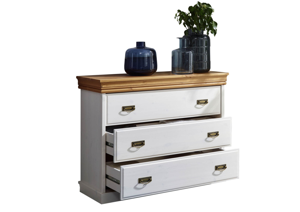 Diese Kommode bringt natürlichen Charme in Dein Zuhause! Gefertigt aus massivem Kiefernholz und weiß gewachst, strahlt sie Wärme und Gemütlichkeit aus. Die honigfarbenen Absetzungen setzen dazu einen tollen Kontrast und machen jedes Stück zum Unikat. In den drei geräumigen Schubladen hast Du genug Platz, um Ordnung zu schaffen – ob im Schlafzimmer, Flur oder Wohnzimmer. Die robusten Metallgriffe runden das Design mit einem Hauch von Vintage ab. Eine Kommode, die Stil und Funktion perfekt vereint!