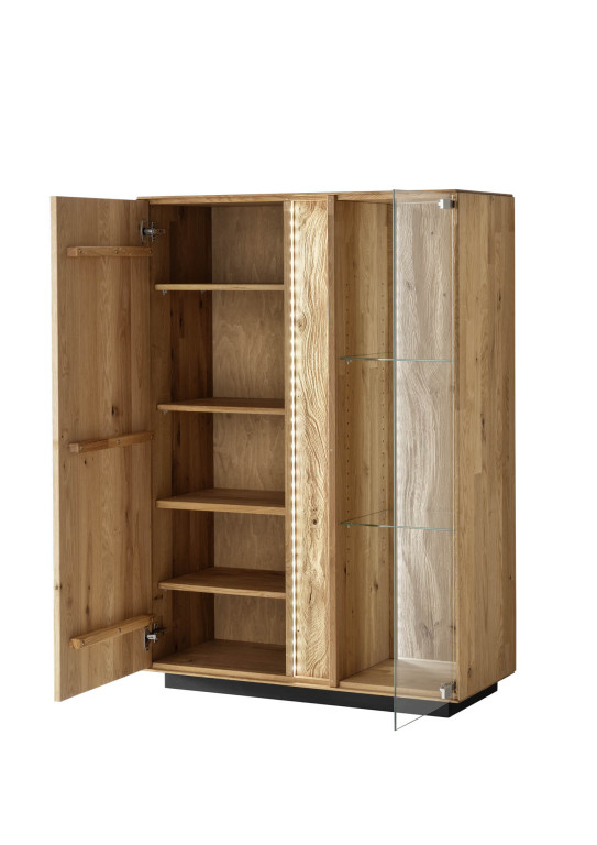 Das elegante Highboard beeindruckt durch seine hochwertige Verarbeitung aus massiver Wildeiche, natur geölt, und verbindet zeitloses Design mit moderner Funktionalität. Die harmonische Kombination aus Holz- und Glaselementen setzt stilvolle Akzente, während die integrierte LED-Beleuchtung für ein eindrucksvolles Ambiente sorgt. Dank durchdachter Innenaufteilung bietet das Highboard großzügigen Stauraum für Geschirr, Gläser oder Wohnaccessoires. Softclose-Technik an Türen und Schubladen sorgt für besonderen Komfort und ein sanftes Schließen. Die sandgestrahlten Rückwände unterstreichen den raffinierten Charakter dieses Möbelstücks. Mit klarer Linienführung und Liebe zum Detail fügt sich das Highboard perfekt in moderne Wohnkonzepte ein und wird zum stilvollen Mittelpunkt Ihres Wohnraums.