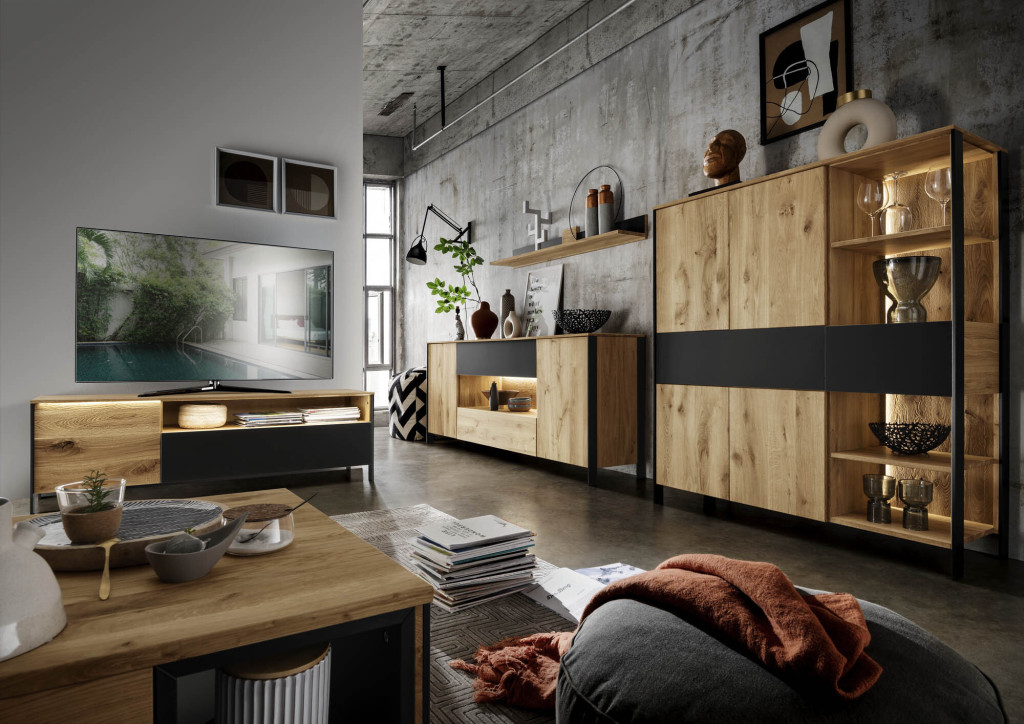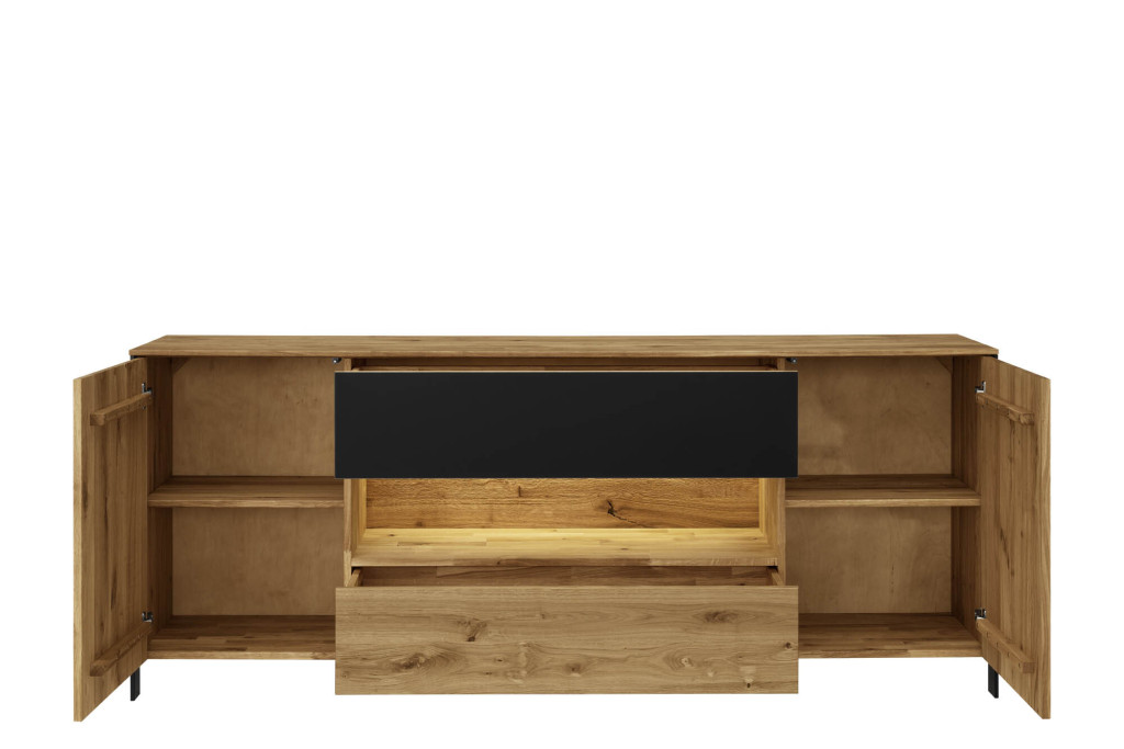 Dieses exklusive Sideboard vereint moderne Ästhetik mit handwerklicher Qualität. Gefertigt aus massiver, geölter Eiche beeindruckt es durch eine natürliche Ausstrahlung in Kombination mit eleganten, mattschwarzen Akzenten. Ausgestattet mit großzügigem Stauraum – bestehend aus Türen, Schubladen und offenen Fächern – bietet es eine funktionale Lösung für Ihr Wohnambiente. Dank integrierter LED-Beleuchtung setzen Sie stilvolle Akzente und schaffen ein angenehmes Raumgefühl. Softclose-Technik bei Türen und Schubladen mit Selbsteinzug sorgt für höchsten Komfort im Alltag. Durch den großen Typenplan haben Sie die Möglichkeit, das Sideboard perfekt auf Ihre Wohnsituation abzustimmen und individuelle Kombinationen zu realisieren. So erhalten Sie ein Möbelstück, das Qualität, Funktionalität und Design auf einzigartige Weise vereint.