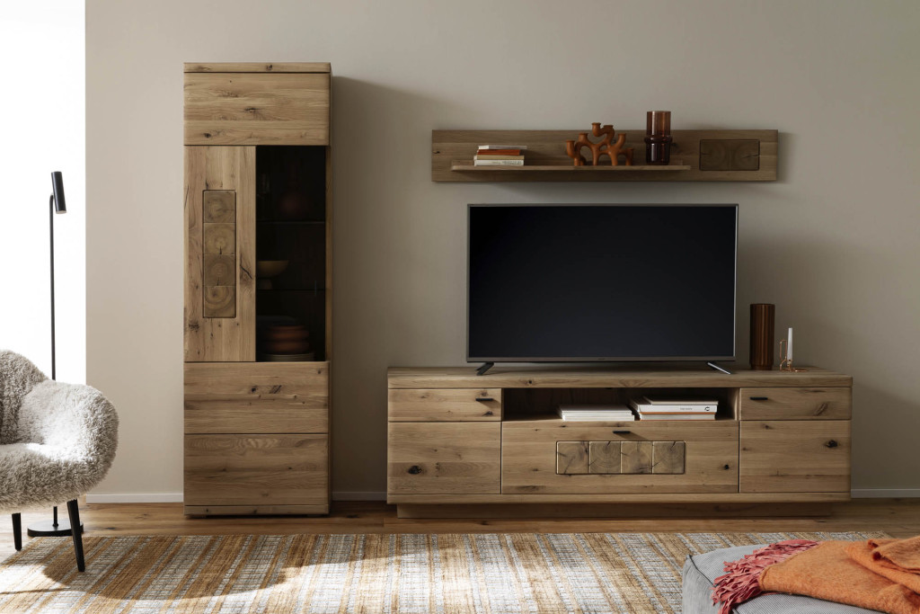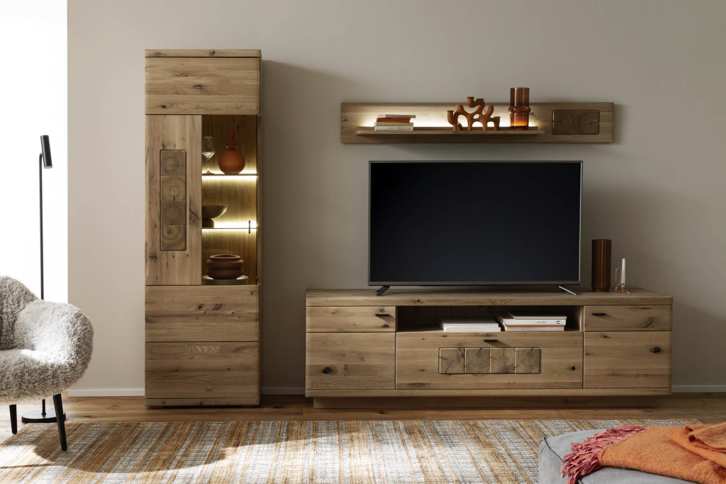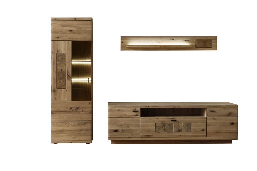 Diese exquisite Wohnwand aus massiver Ast/Balkeneiche, veredelt in Kristalleiche geölt, fügt jedem Raum eine Dimension von Luxus und Naturverbundenheit hinzu. Besonders hervorzuheben sind die einzigartigen Hirnholz-Applikationen, die die natürliche Textur und Maserung des Holzes betonen und für eine visuell ansprechende Struktur sorgen. Der großzügige Typenplan bietet umfangreiche Gestaltungsmöglichkeiten, um Ihre Wohnräume individuell und funktional einzurichten. Optional ist eine Beleuchtung erhältlich, die die Schönheit des Holzes unterstreicht und eine warme, einladende Atmosphäre schafft. Dieses Möbelstück verbindet Handwerkskunst mit modernem Design und wird so zum Mittelpunkt Ihres Zuhauses.