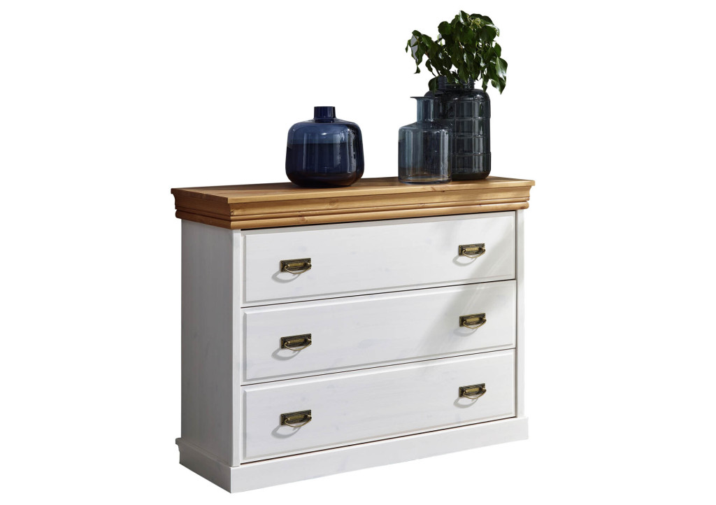 Diese Kommode bringt natürlichen Charme in Dein Zuhause! Gefertigt aus massivem Kiefernholz und weiß gewachst, strahlt sie Wärme und Gemütlichkeit aus. Die honigfarbenen Absetzungen setzen dazu einen tollen Kontrast und machen jedes Stück zum Unikat. In den drei geräumigen Schubladen hast Du genug Platz, um Ordnung zu schaffen – ob im Schlafzimmer, Flur oder Wohnzimmer. Die robusten Metallgriffe runden das Design mit einem Hauch von Vintage ab. Eine Kommode, die Stil und Funktion perfekt vereint!